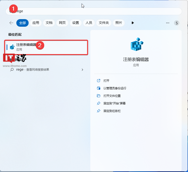 2. 搜索 regedit,然后打开注册表编辑器