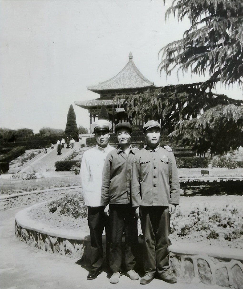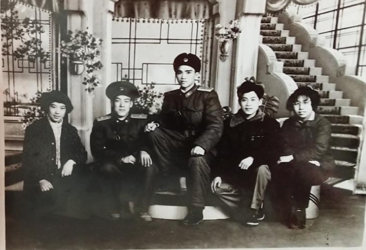 图为五位青年男女合影,他们三男两女,两个男子穿着制服,看起来非常帅气。那个年代,能穿上制服,说明已经进入了体制,都是很了不起的。