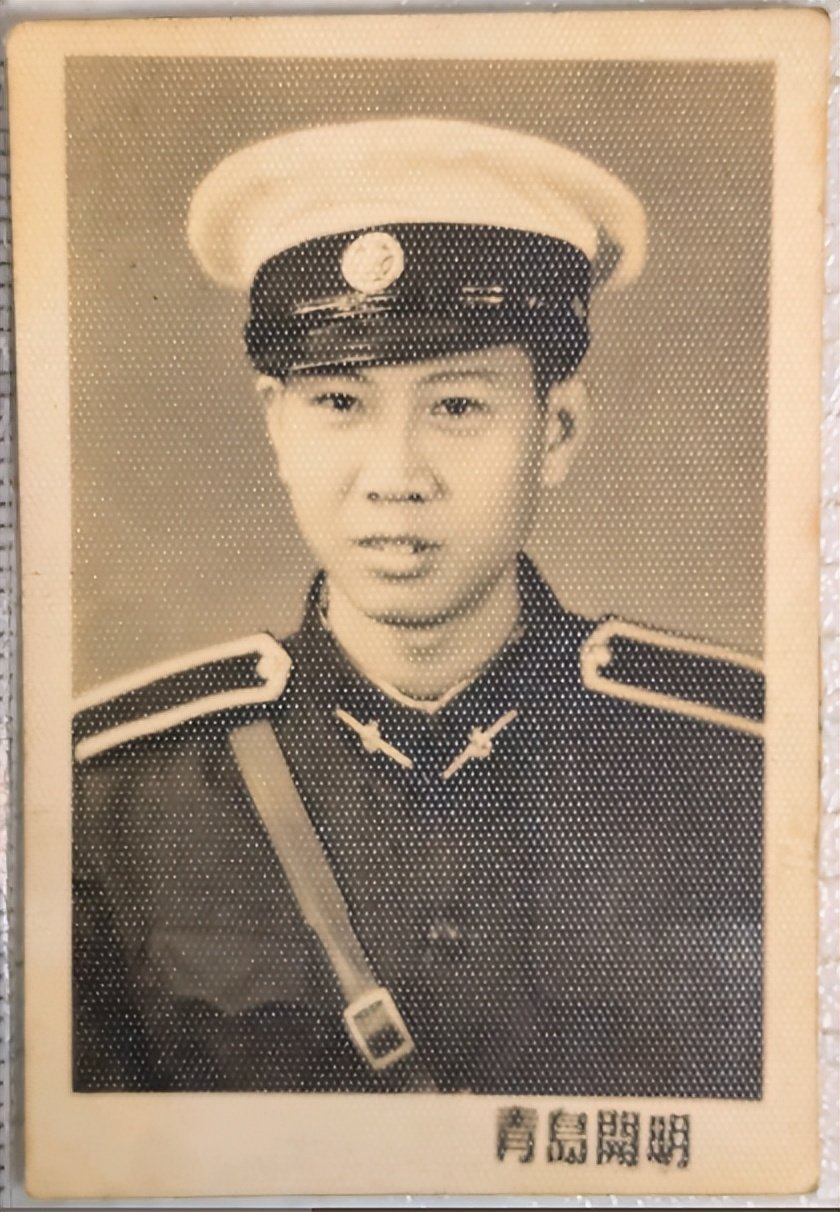 这是一张在青岛开明相馆拍摄的老照片,拍摄时间是上世纪五六十年代,照片上的青年警察目光如炬,英气逼人,十分帅气,完全是个小鲜肉,但是比现在的小鲜肉多了几分硬朗的气质。穿起制服,这样的男孩子,当年一定是很多女孩心目中的白马王子吧!
