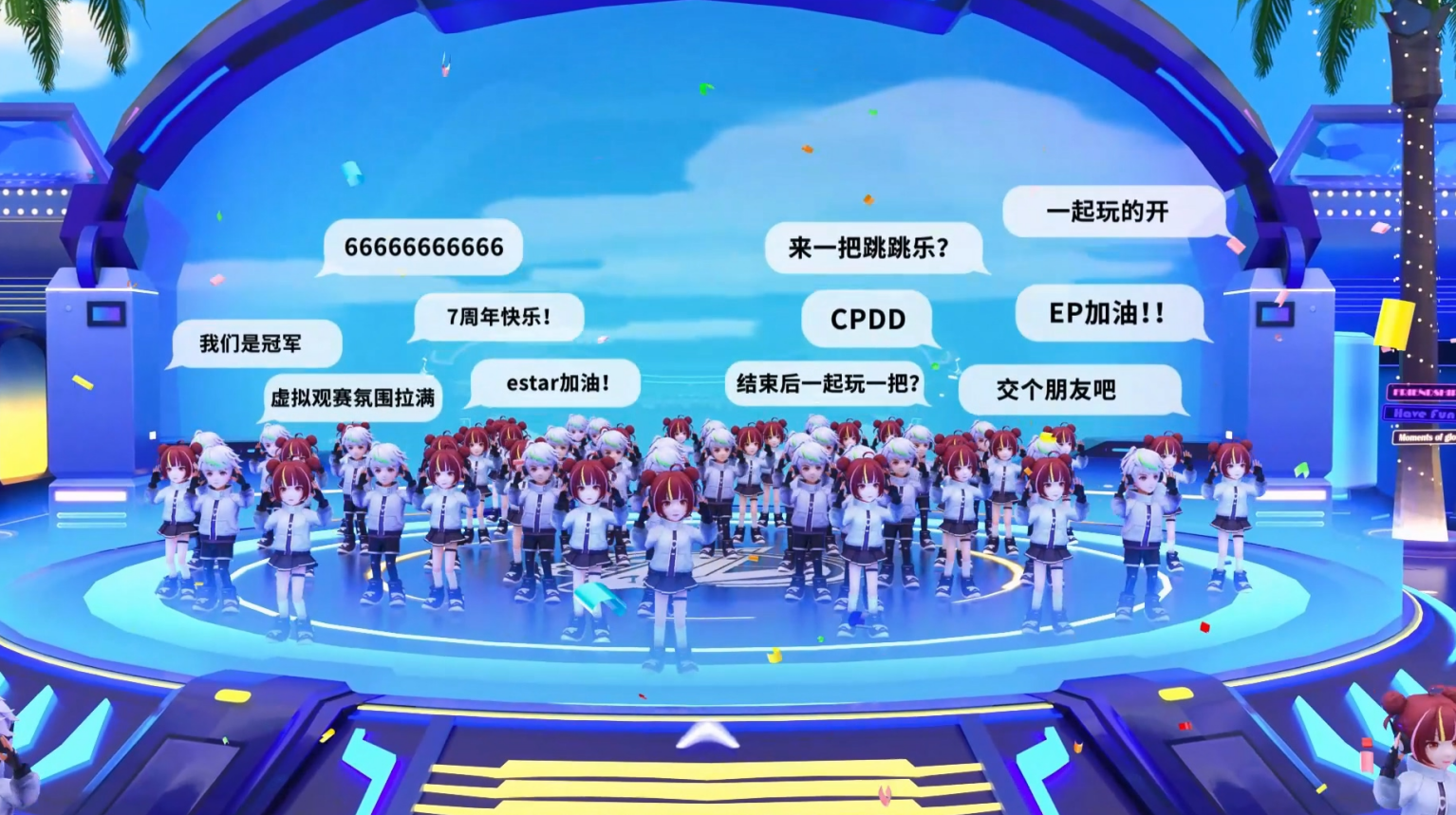比如在虚拟观赛2.0,对比之前的1.0观赛系统,此次新增加了定制场馆、专属队服、快捷发言、应援喷漆、应援战旗、应援礼花、醒目留言、主场争夺、空投宝箱,以及最好玩的“跳跳乐”。玩家们仅需要前往虚拟观赛大厅,选择自己支持的队伍,然后设置自己喜好队伍的队服,然后就可以找到同队粉丝,并为自己的队伍喝彩加油。