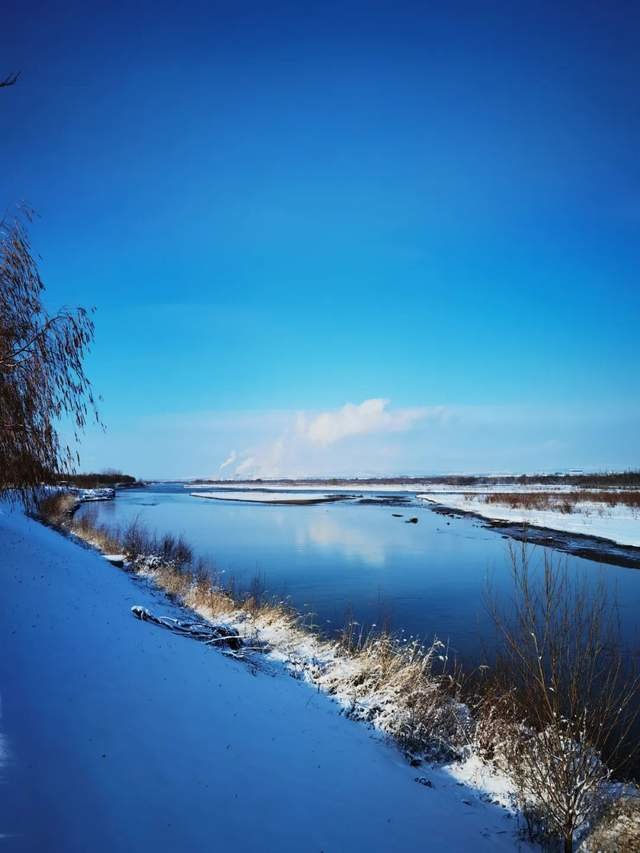 寒冬时节,镜头下的伊犁河两岸,天蓝水清,与河面倒映出的云彩搭配,别有一种祥和的静谧。冬天的太阳那么温暖,远山、田野、河流、白雪,构成一幅和谐美妙的景致。
