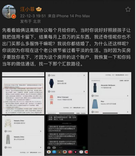 同日,汪小菲就现身说法,汪小菲非常生气的表示大S“睁眼说瞎话”,发文称先看看离婚协议里每个月给你的。后面汪小菲提到当时大S说为了好好照顾孩子,所以才把信用 卡留下了,结果每个月大S买上百万的东西……随即汪小菲晒出双方离婚协议部分截图与大S购物订单、刷卡记录。