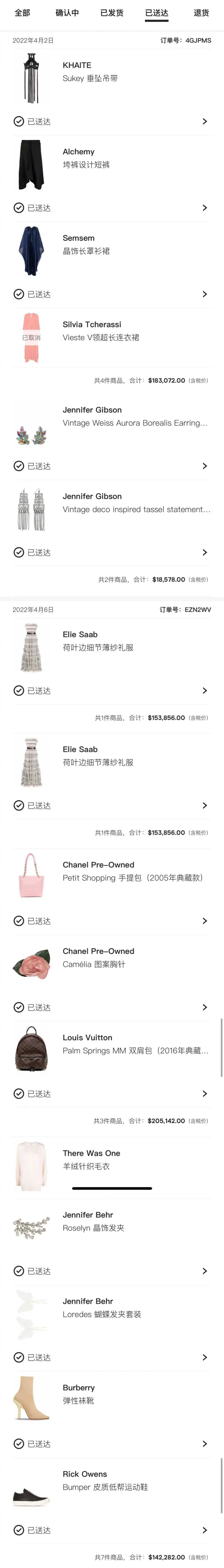 订单记录显示,大S购物日消费动辄数十万元,最高一天花一百余万台币。订单内容囊括了全球众多奢侈品品牌: