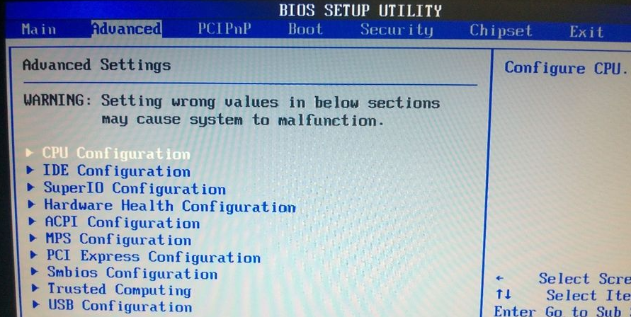 2.在BIOS我们正在选择页面设置CPU设置此选项Advanced。