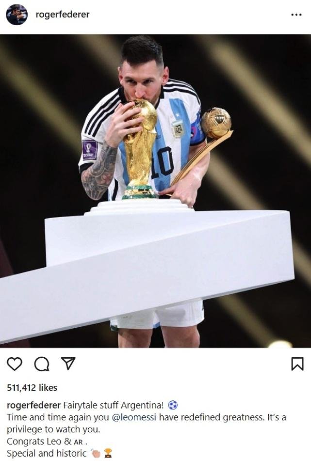 不久前退役的网坛巨星费德勒则动情写道:“童话般的阿根廷。梅西你一次又一次重新定义伟大,看你踢球是一种荣幸,祝贺里奥和阿根廷,特殊和具有历史性的奖杯。”