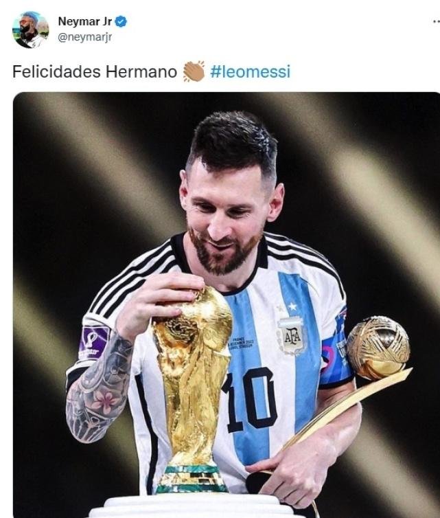 除了其他领域的巨星,足坛其他国家队的球星们也纷纷向梅西祝贺。好友内马尔第一时间晒出梅西抚摸大力神杯的照片并写道:“恭喜你,兄弟!”