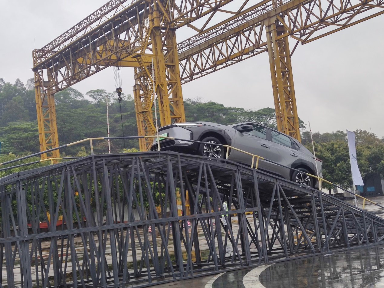 另外值得一提的是,丰田联合斯巴鲁给bZ4X打造的那套四驱真的具备一定的越野能力,测试场地中的上陡坡、单边桥、滑轮组、交叉轴,它全都能轻松完成,开它过这些障碍时,你基本不用发挥什么技术,只要控制好方向和电门就行。如果电门你都不想控制,甚至还能开启它的蠕行模式,打好方向过就行。就社长的体验来看,在电车中,四驱越野性能比它好的,基本没几个。