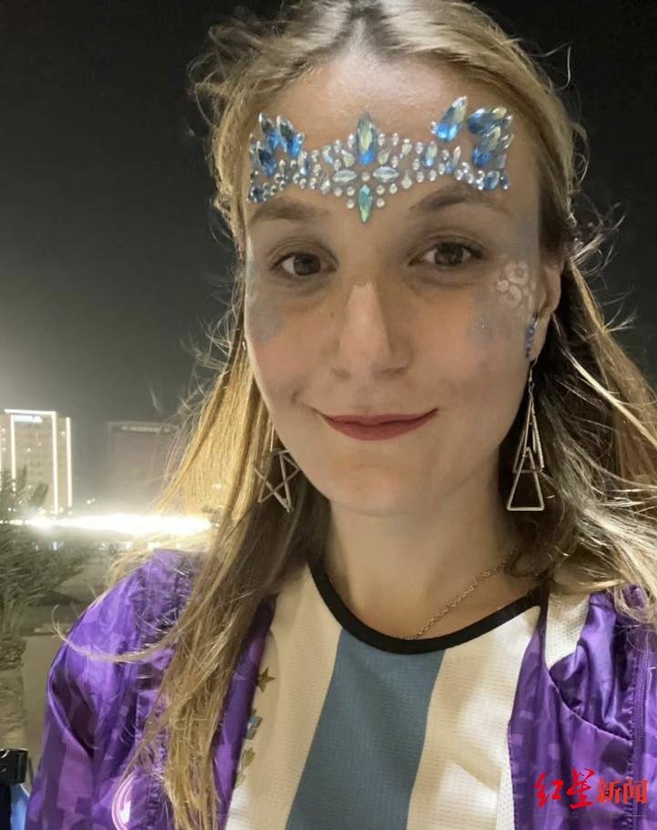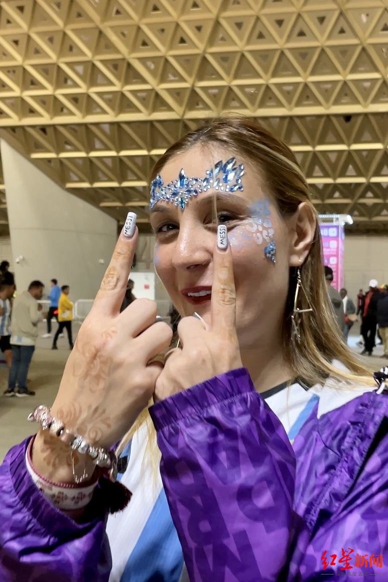为了看球,阿果特地打扮了一番,除了身着阿根廷蓝白色的球衣,她还带着羽毛帽满脸化满了阿根廷国旗颜色的彩绘。此外,她还专门请人给她设计了一套助威美甲,上面除了阿根廷国旗外,还有梅西的名字和球衣号。