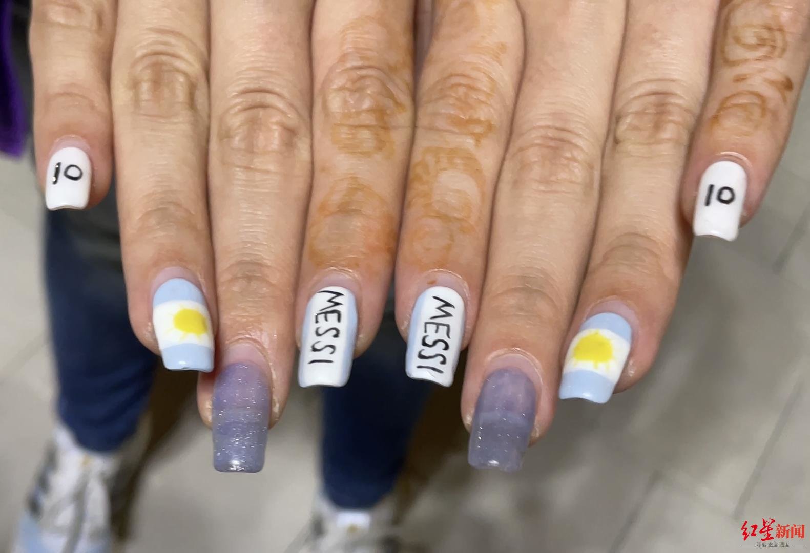 来自阿根廷的女球迷“阿果”,将自己的指甲涂上梅西的名字