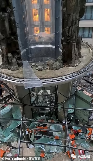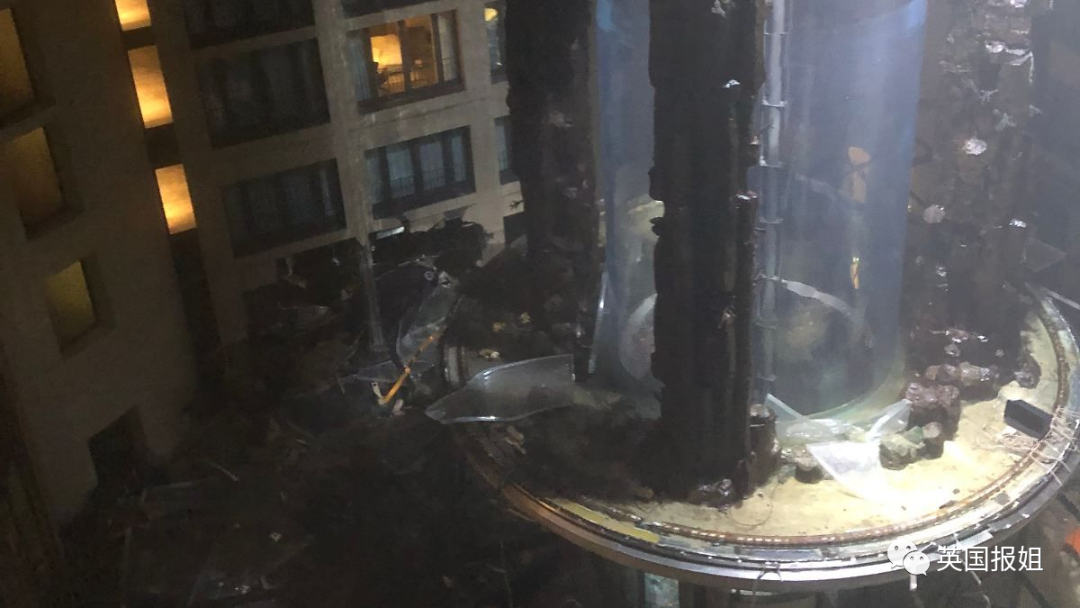 水族箱里的100万升水喷涌而出,直接把酒店大厅淹了,还导致周围电力瘫痪。
