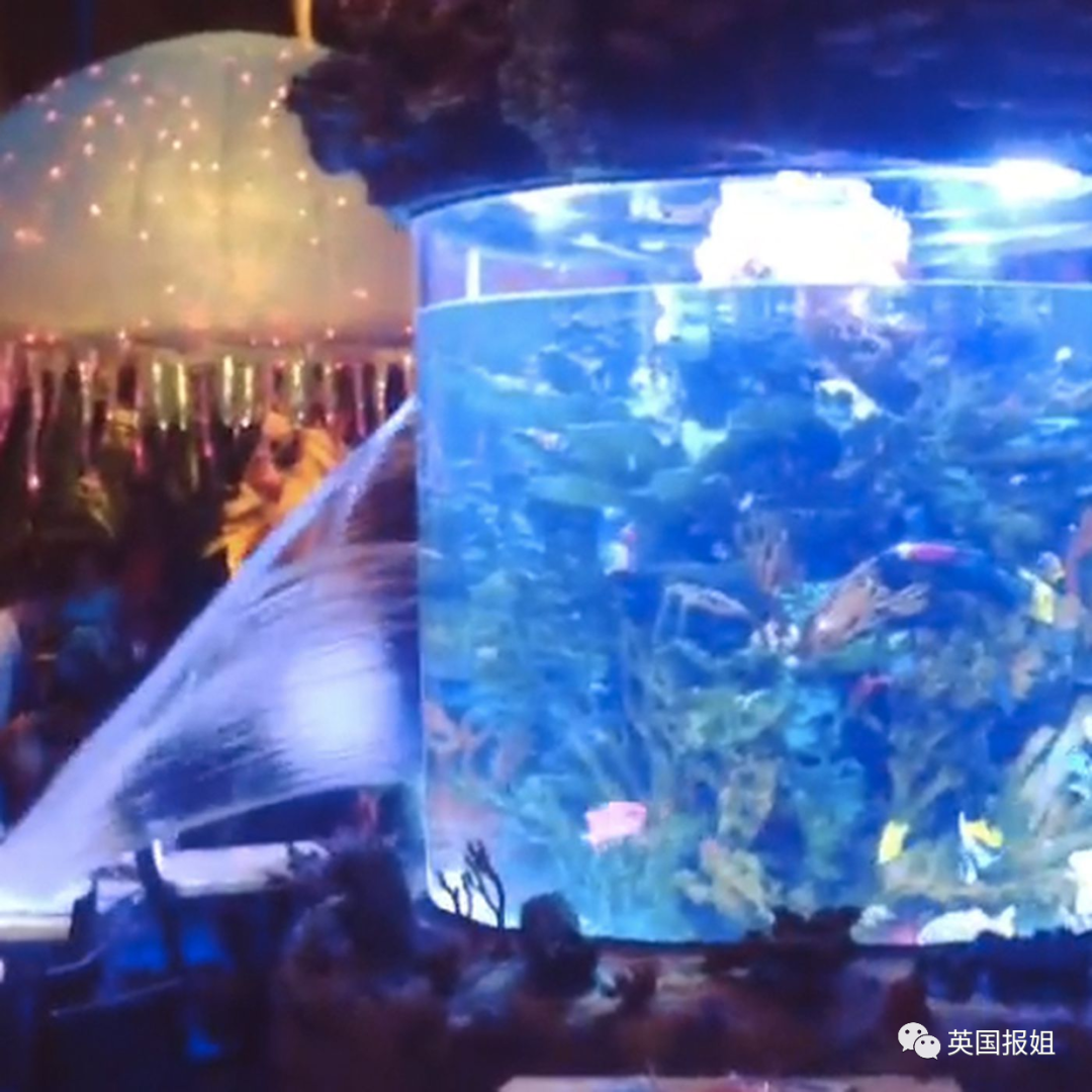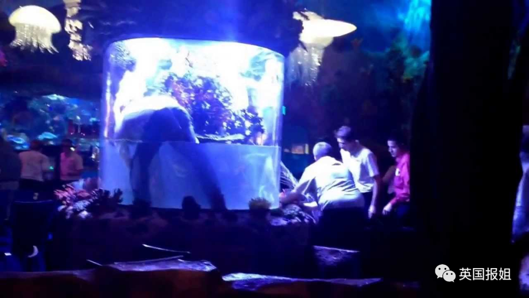 在晚餐时段,餐厅中间的大型圆柱水族箱上,两个弧形亚克力玻璃粘合的缝隙突然裂开,把周围的食客都淋成了落汤鸡,不过水族馆里的鱼都没什么事。