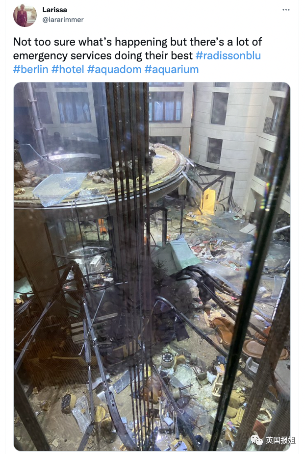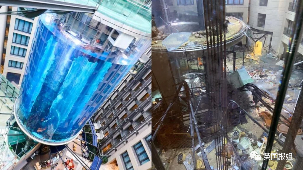 当时有人以为是谁在外面放烟花,但酒店内明显的震感告诉它们,事情没那么简单。一名住客拉开窗帘后惊呆了,Aquadom水族箱爆炸了!