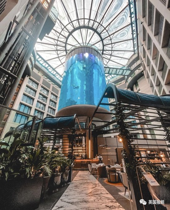 壮观的奇观式水族馆在建成后立马成为了柏林著名的旅游景点,酒店住客可以从房间的窗户直接看到Aquadom,惬意地欣赏美景,还可以看到潜水员在里面游动。