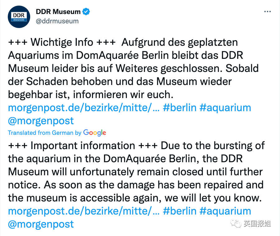 不过值得庆幸的是,救援人员已经把这部分鱼转移到了安全的地方,在水族馆恢复使用前,会暂时寄养在柏林的各大动物园。
