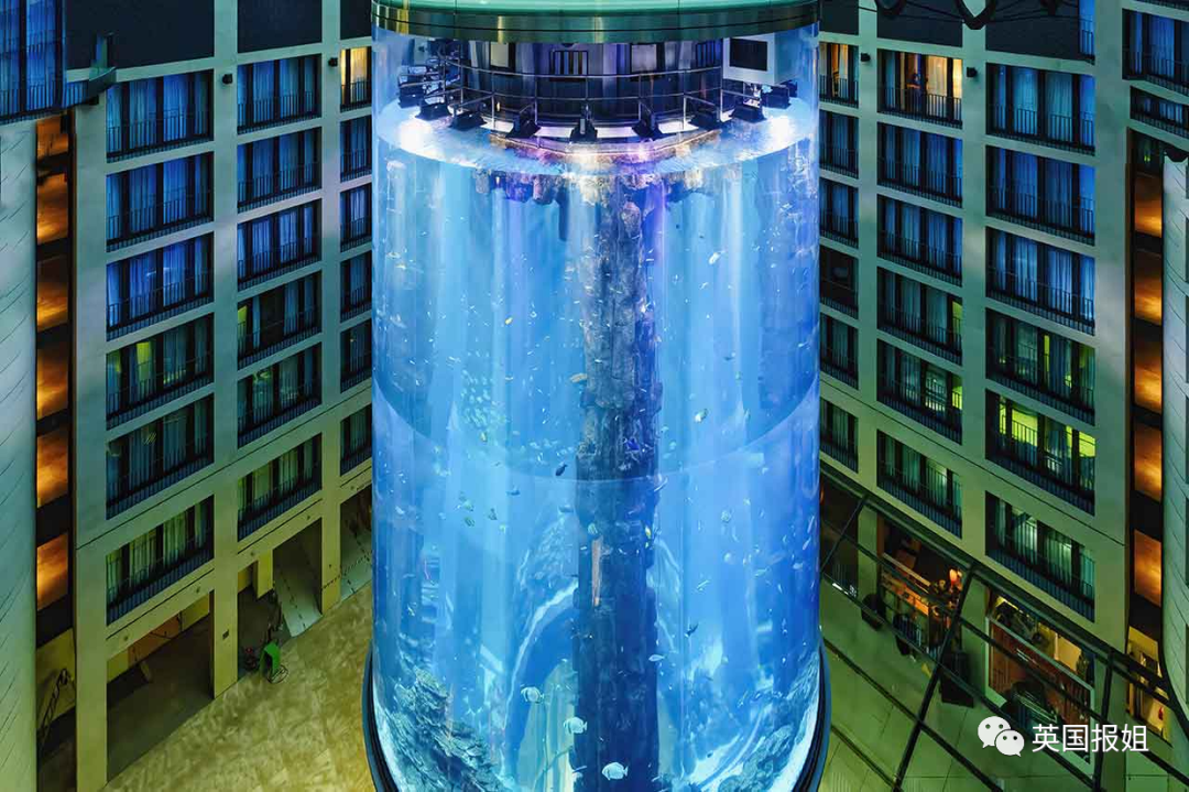 虽说叫水族箱,其实它有24米高,垂直高度相当于8层楼,是经过认证的世界最大圆柱体水族箱。耗资约1280万欧元(约9450万人民币),2003年建成。