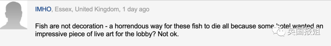 “鱼不是一种装饰品,只是因为一家酒店想搞一个吸引人的活体艺术品放在大堂,就导致了这么多鱼以如此悲惨的方式死去。实在无法接受。”