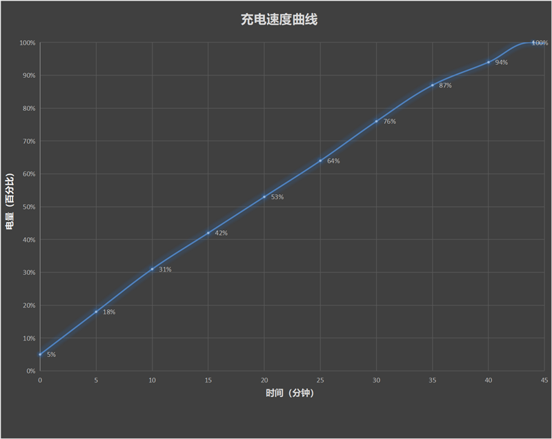 经过测试,手机电量从5%开始充电,5分钟即可充至18%,10分钟充电至31%,20分钟即可充至一般的电量,达到53%,半小时充电76%,完全充满仅需要44分钟。