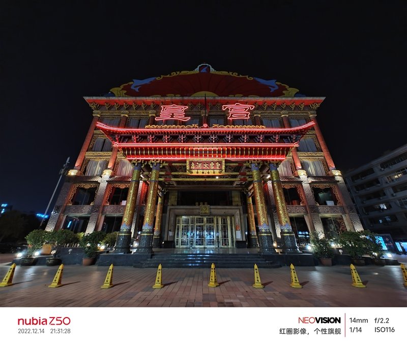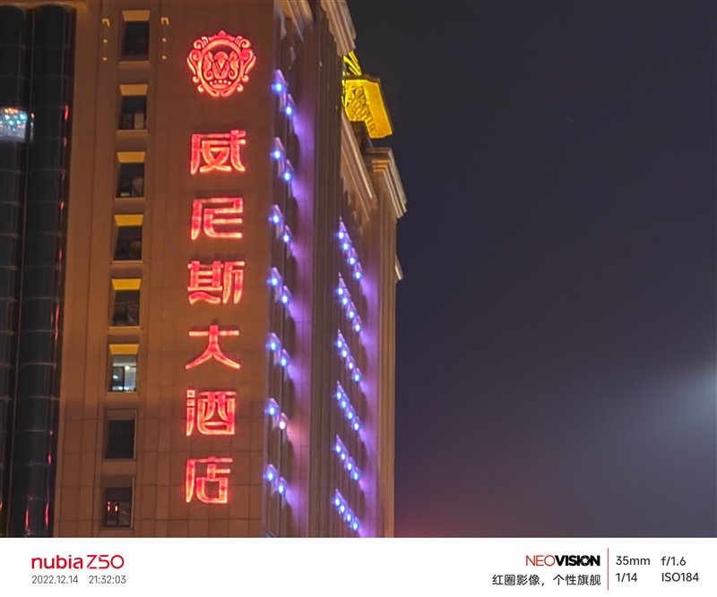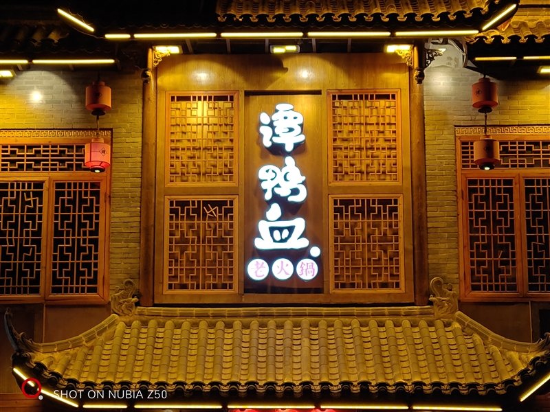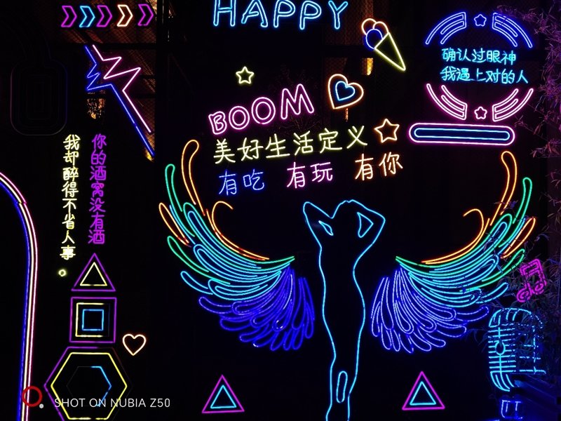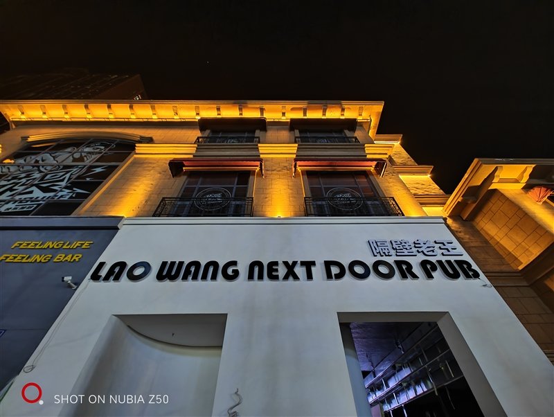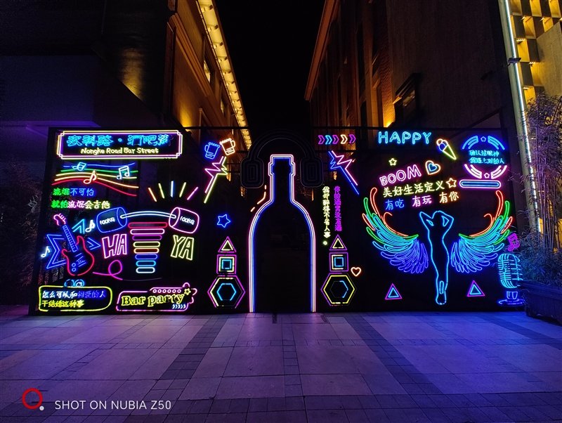夜景方面,努比亚Z50经过算法提升了整体的亮度,暗区下的解析力也更强,样张色彩明暗还原更加真实,显现出暗光下灯光与灯牌之间的层次感。
