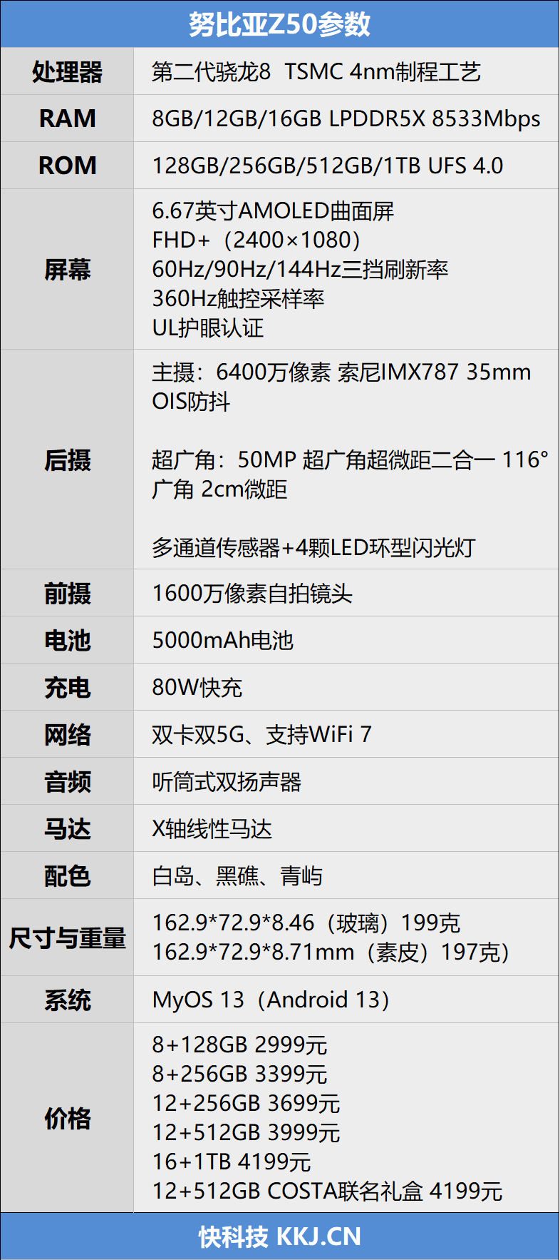 努比亚Z50配备了5000mAh大容量电池,保证其拥有优秀的续航,同时具备80W快充。