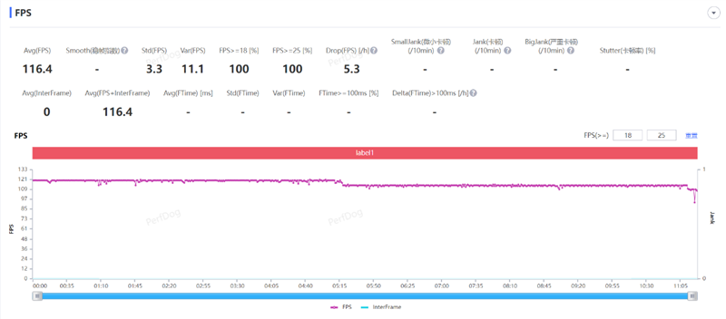 王者荣耀手游在开启 极高帧率与超高分辨率下,游戏以120FPS运行,前5分钟游戏可稳定在最高帧率,到了5分钟左右,游戏降至114FPS运行,估计是为了控制温度,最终平均帧率维持在116.4FPS。