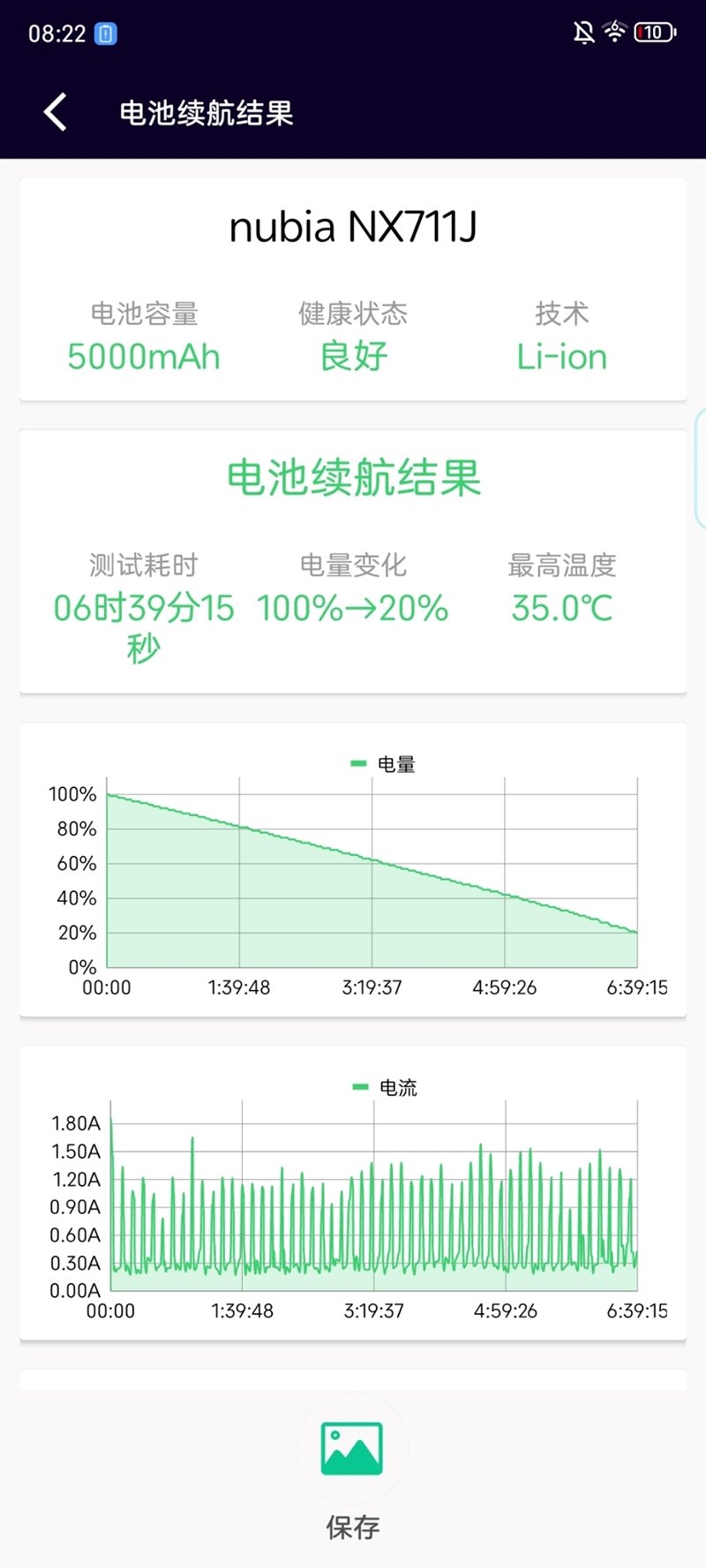 经过测试,努比亚Z50的电量从100%消耗至20%,用时6小时39分钟,经过折算,满电续航可以达到近9小时左右,可满足日常用户一天的使用。