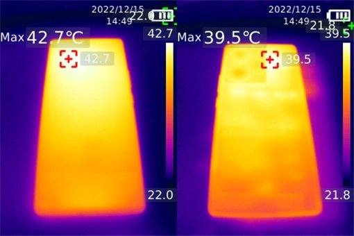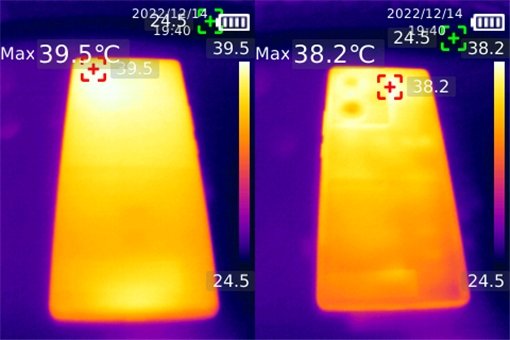 在温度方面,机身正面39.5摄氏度,位于手机顶部位置,机身背面38.2摄氏度,位于摄像头区域,横握手机会感受到有些许热量,如果介意的话可以避开这两个区域。