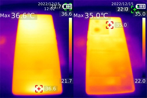 温度方面,机身正面最高温度36.6摄氏度,位于机身底部,背面最高温度35摄氏度,位于相机模组右方,双手握持不会感到特别热。