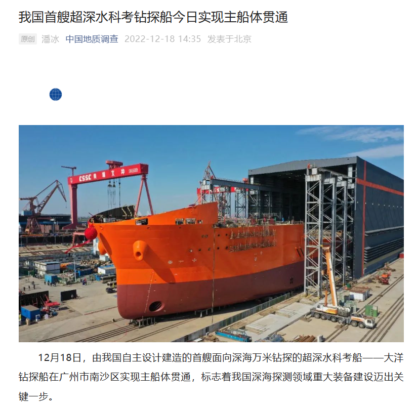 IT之家 12 月 18 日消息,据中国地质调查局官微消息,12 月 18 日,由我国自主设计建造的首艘面向深海万米钻探的超深水科考船 —— 大洋钻探船在广州市南沙区实现主船体贯通,标志着我国深海探测领域重大装备建设迈出关键一步。