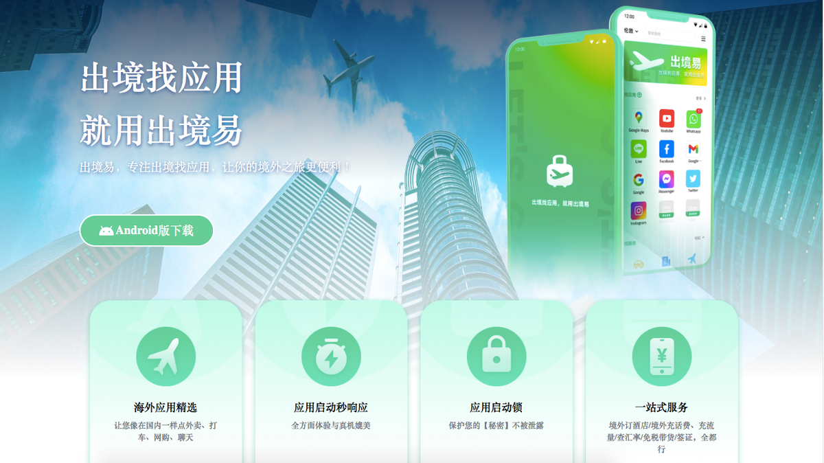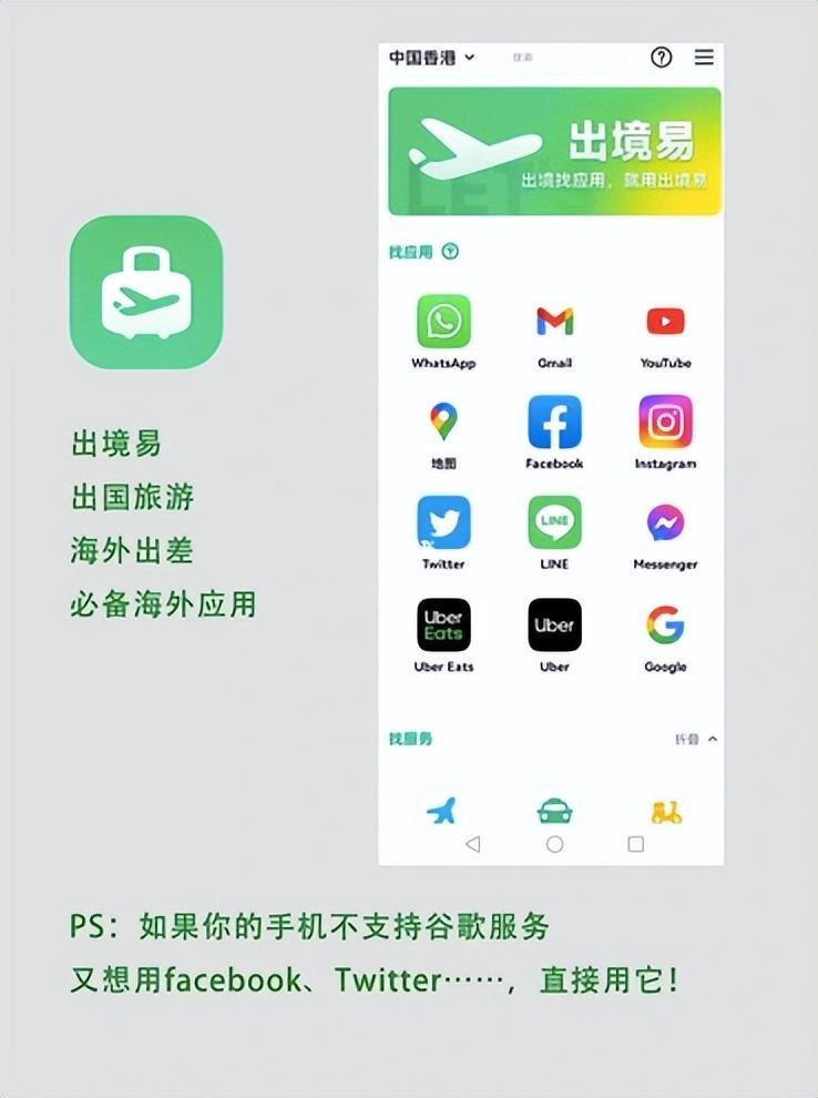 也就是说不管你的手机有没有谷歌框架,一个“出境易”就能基本解决出国后需要通过手机操作的所有问题。在没有“出境易”之前同事说出国需要收藏很多网站、安装谷歌框架,甚至到外国后直接买台新手机,但现在有了“出境易”就方便的多了。