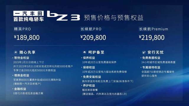 伴随bZ3预售发布,一汽丰田还带来了丰厚、贴心礼遇。“随心先享”包含等待金权益、增换金权益以及0首付/0息或低息金融方案,“呵护备至”包括10年或20万公里免费基础保养、10年或20万公里电力驱动系统免费保修、免费安装充电桩及养护权益,“安行无忧”包含免费救援权益、专属接待权益,多重政策覆盖购车到用车全生命周期,让用户的纯电车生活变的安心、省心、放心。