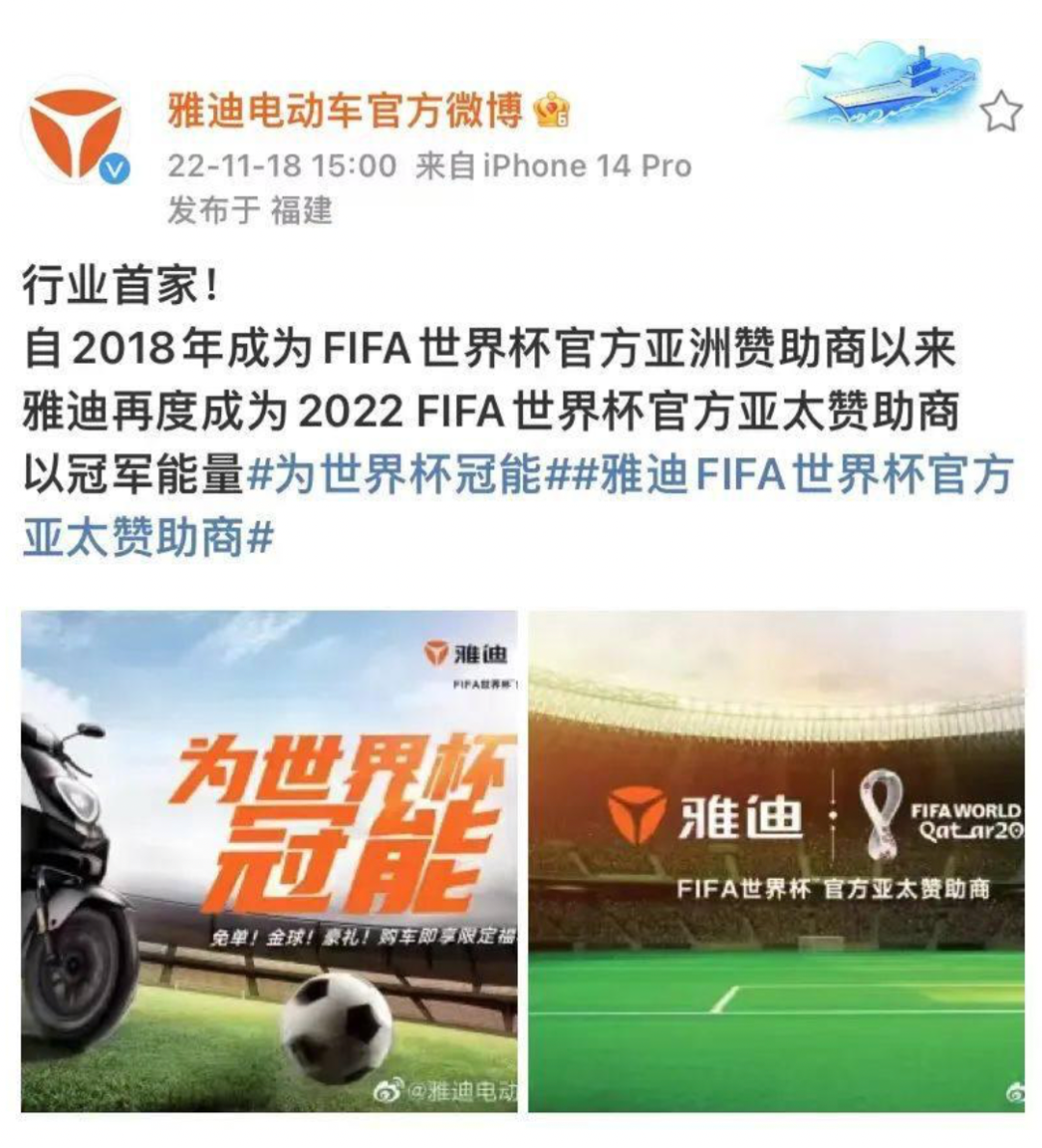 这也是继2018年成功牵手俄罗斯世界杯后,雅迪与FIFA的梅开二度,使他成为了全球两轮电动车行业内,首家两度赞助世界杯的企业。