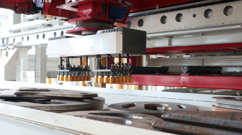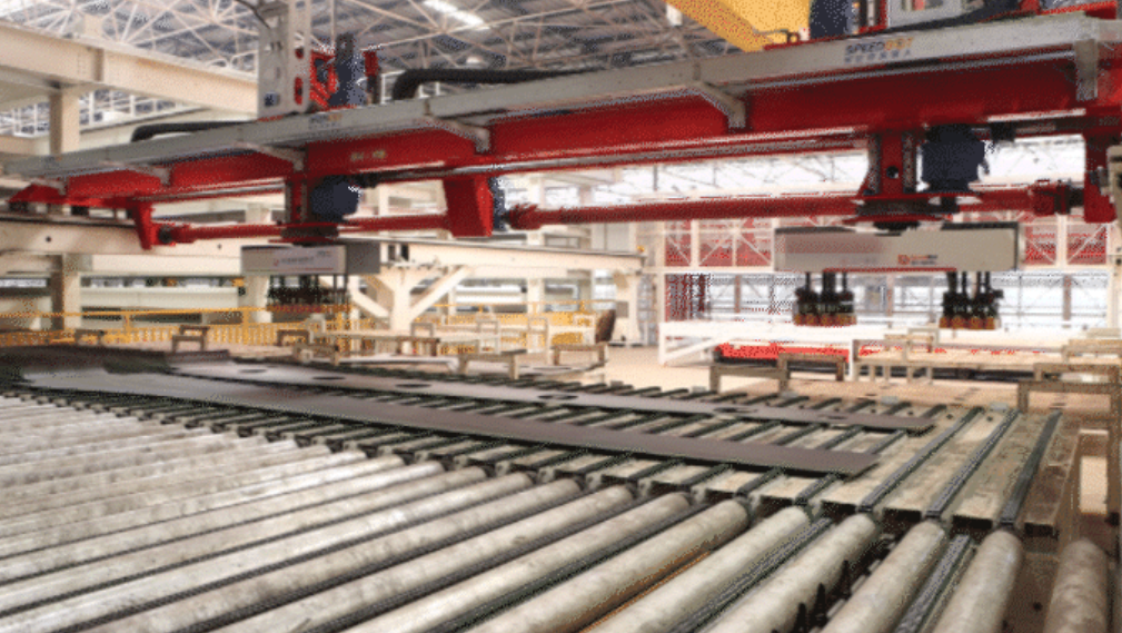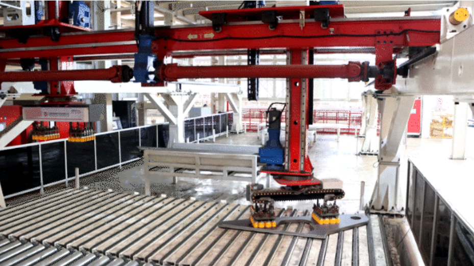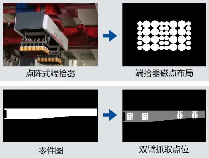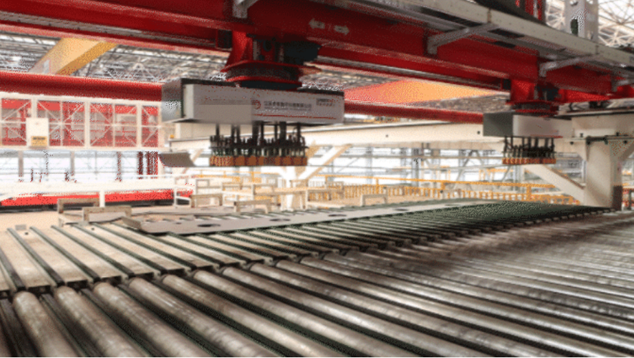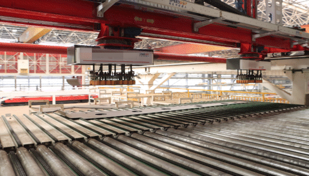 在双层桁架上,安装10套可水平旋转、柔性可控的机械手端拾器/机械抓手,实现对不同尺寸和结构的零件的高柔性、精准抓取。针对9米以上的重型钢板零件,采用双臂协同抓取方式,实现大型零件的准确抓取和放置。