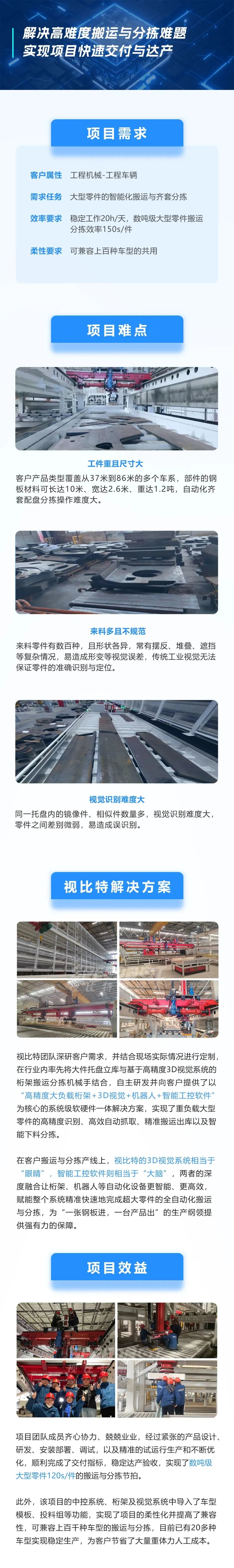 在某工程机械行业巨头的智慧工厂内,视比特机器人携手中车数字交付了行业内首个大件立库桁架搬运分拣项目,以先进的“AI+3D视觉”技术突破了重型工件精准定位、海量工件准确识别等多项技术难题,实现了复杂工况下超大负载零件的全自动齐套搬运与拣选。项目完成后数吨级大型零件的搬运分拣效率提升至120s/件。