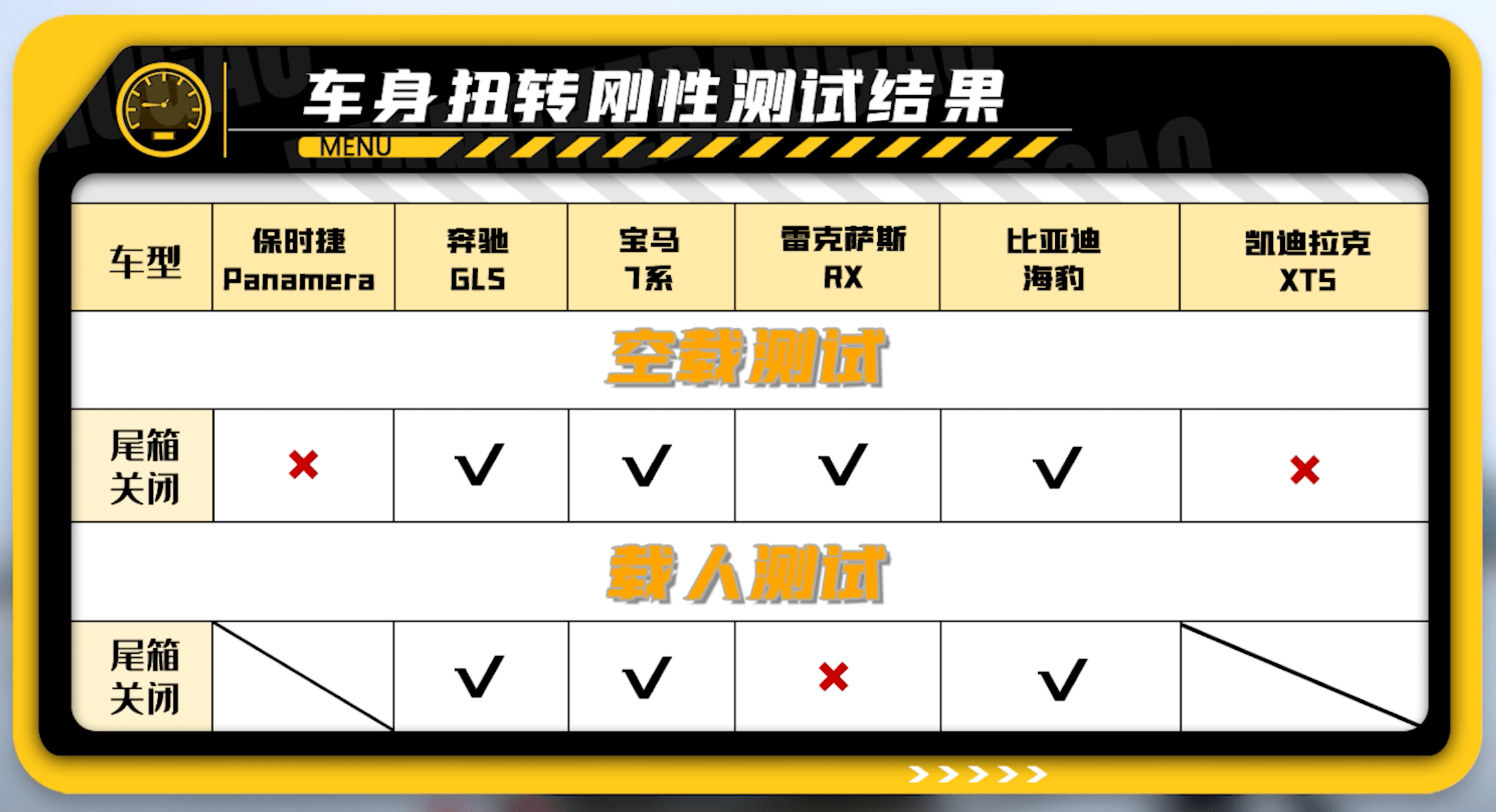 前一段时间,有媒体进行了车身扭转刚性的测试,参与测试的车型有6款,分别是奔驰GLS、宝马7系、保时捷Panamera、凯迪拉克XT5、雷克萨斯RX和比亚迪海豹,价格从20万-200万不等。测试的项目为空载车身扭转刚性测试和载人车身扭转刚性测试。