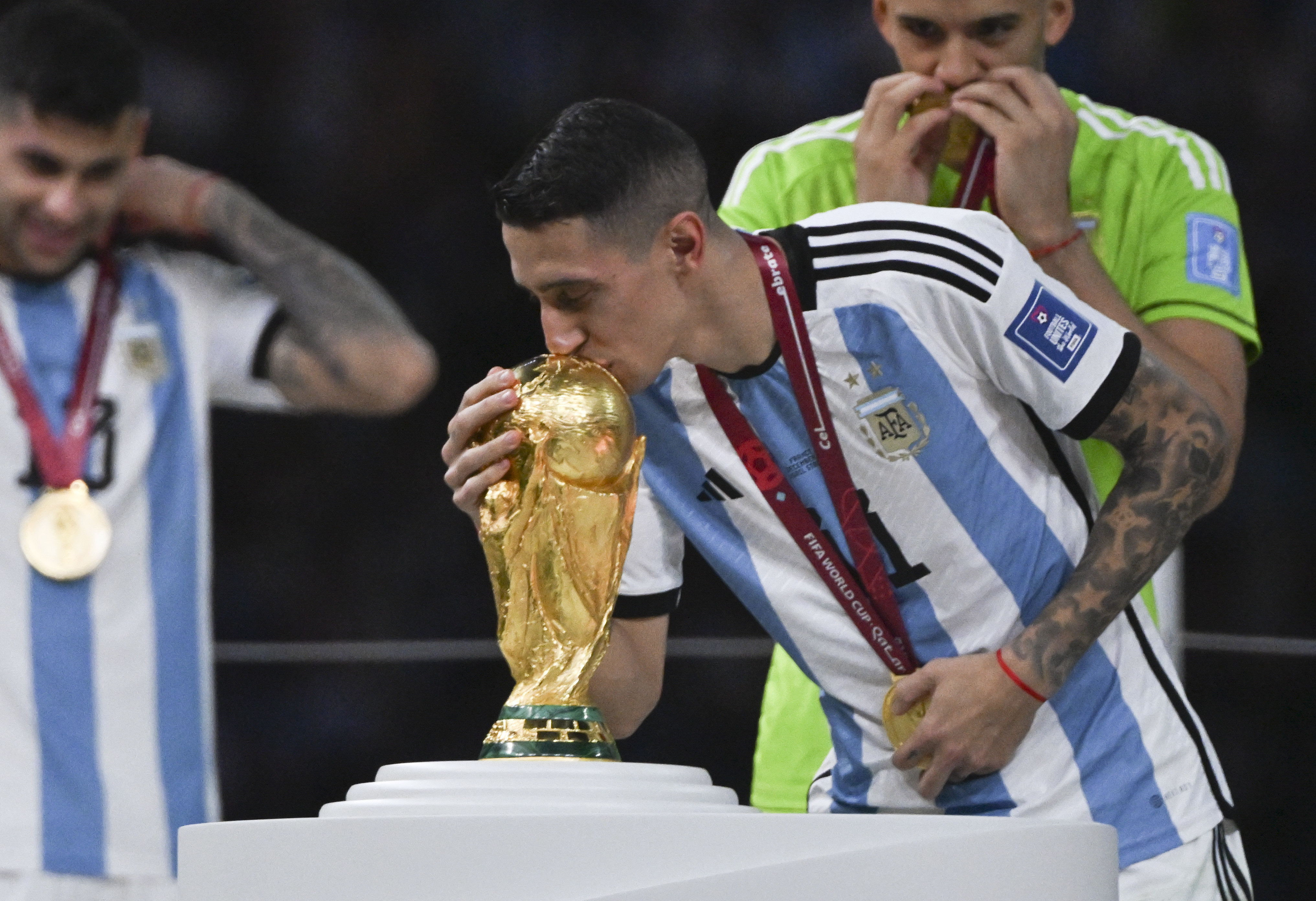 12月18日,阿根廷队球员迪玛利亚(前)在颁奖仪式上亲吻大力神杯。 新华社记者 李尕 摄