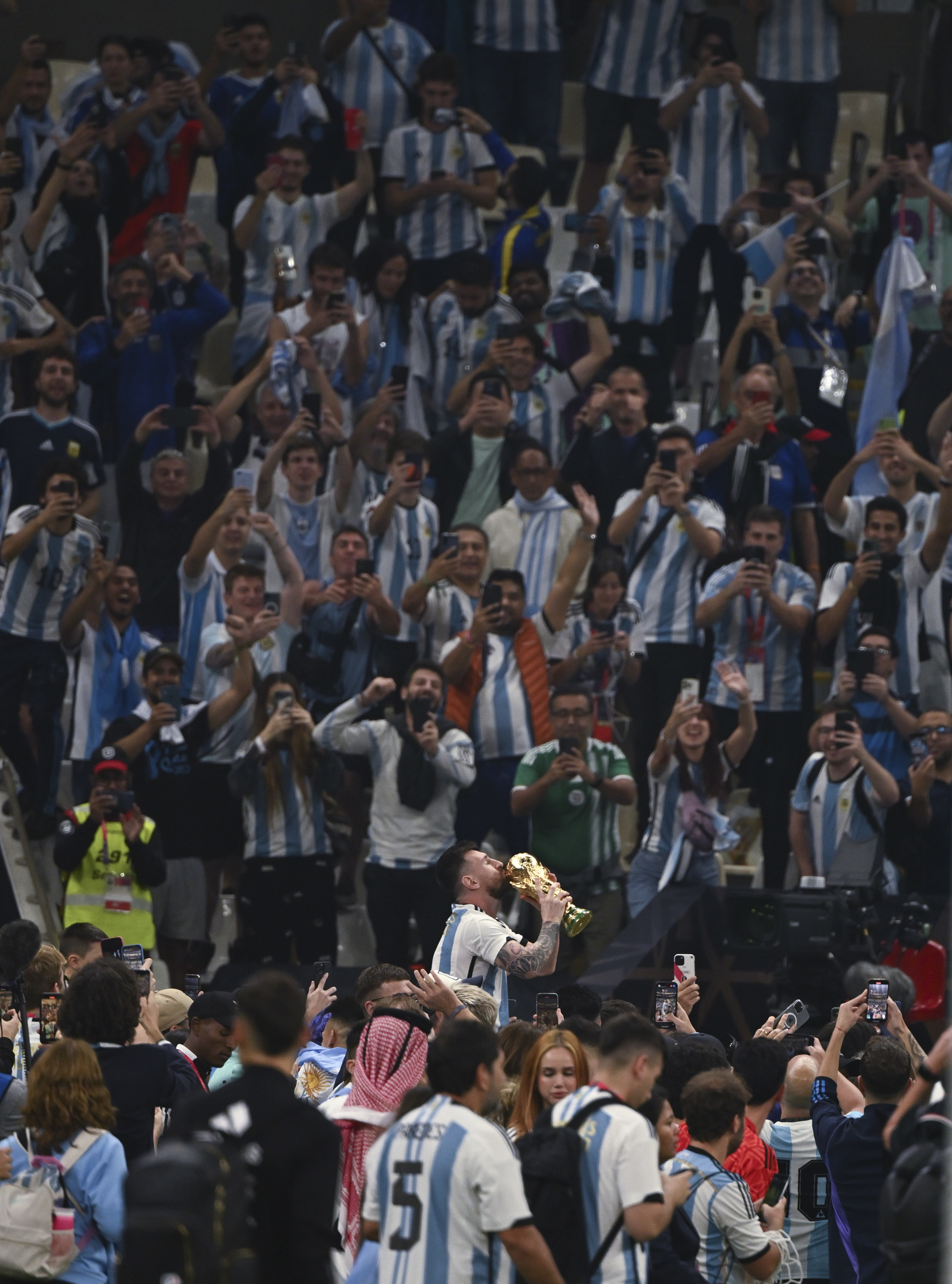 12月18日,阿根廷队球员梅西(前上)在颁奖仪式后举起大力神杯庆祝。 新华社记者 李尕 摄