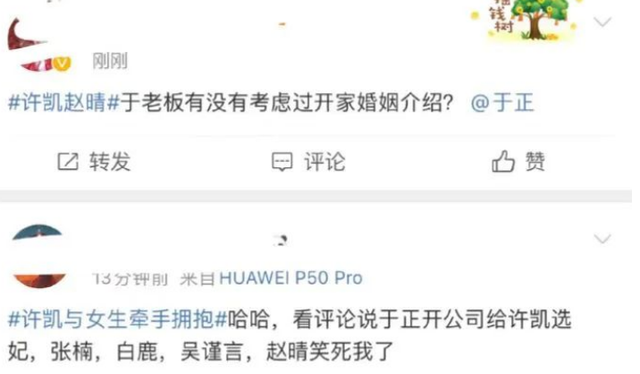 实时热搜评论,则有网友吐槽他应该去开一家婚姻介绍所,还有部分的人开始猜测,于正或许是在帮许凯“选妃”,认为于正知道许凯对网红的偏好,所以旗下公司一直都在签网红。