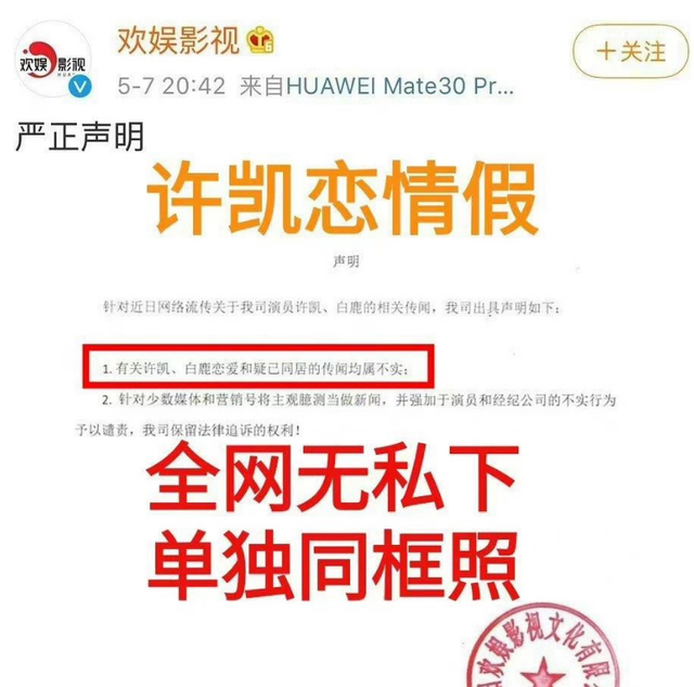 但在当时,白鹿和许凯双双否认谈恋爱传闻,公司也直接晒出声明辟谣。