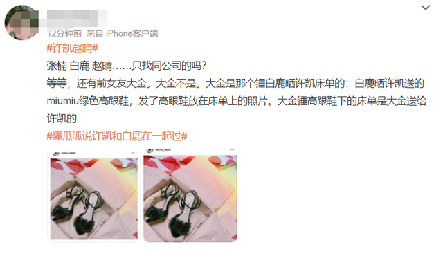 当时许凯的前女友大金还导致白鹿陷入第三者风波之中,白鹿晒出许凯送的miumiu绿色高跟鞋,发了高跟鞋放在床单上的照片,大金则表示,高跟鞋下的床单是她送给许凯的,这件事情也导致白鹿遭遇不少骂声。