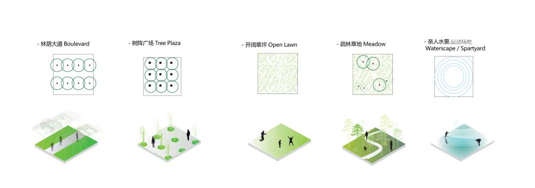 其次,结合场地现有条件,用五种空间原型(林荫大道、树阵广场、开阔草坪、疏林草地、近人水景)串联及过渡完成邻里到公共社区中心及商业空间的氛围转换,开阔的草坪场地叠合各类尺寸可变运动场地预留,如街头篮球、门球等, 可以同时满足主题活动和周边居民的活动要求,形成可复合利用的多功能活力空间。其中, 开阔草坪作为这个项目的核心要素发展, 根据现场调整与动静区关系划分为不同尺度, 再经由林荫大道, 树阵广场, 疏林草地的调和, 重塑草坪的边界, 鼓励人们进入及使用草坪空间。