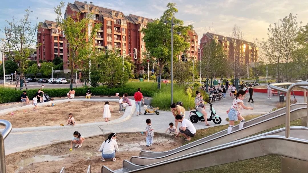 此外,也要平衡儿童与全年龄段的使用特点。我们主张邻里与社区空间是为所有人而设计,不刻意区分老年人、残疾人等群体的特定使用空间,而是力求大部分空间尽量是无障碍可达的,尽量满足各个年龄层的自主活动需求,以求更好服务于周边居民,成为一个以人为本的“城市会客厅”。为儿童设计的游戏场重在“自由玩耍”,丰富的地形与亮丽的色彩吸引孩子的注意,让孩子的平衡和运动能力得到充分开发,自然材料或是自然的元素,如石材、木材、水、植物,则触发孩童的感官感受。同时,家长们的交流区也就在近处。