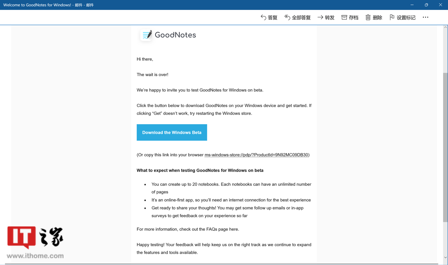 GoodNotes 已通过邮件发送商店下载链接,初版软件疑似网页版套壳,功能十分简陋,暂无云同步功能,可直接通过浏览器链接 https://web.goodnotes.com/home 访问。