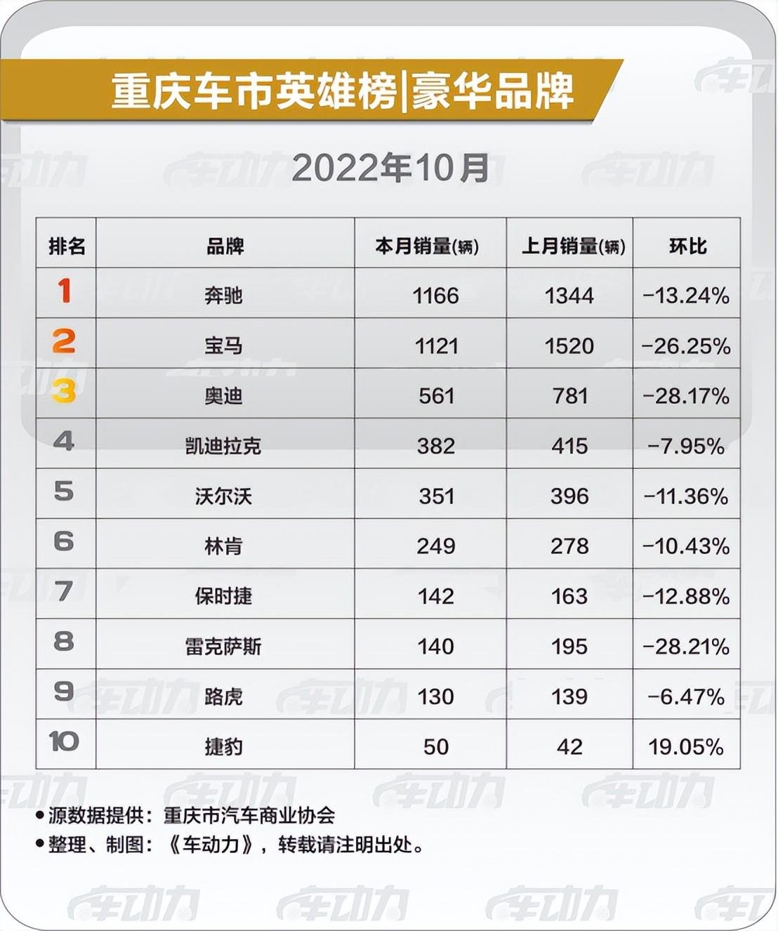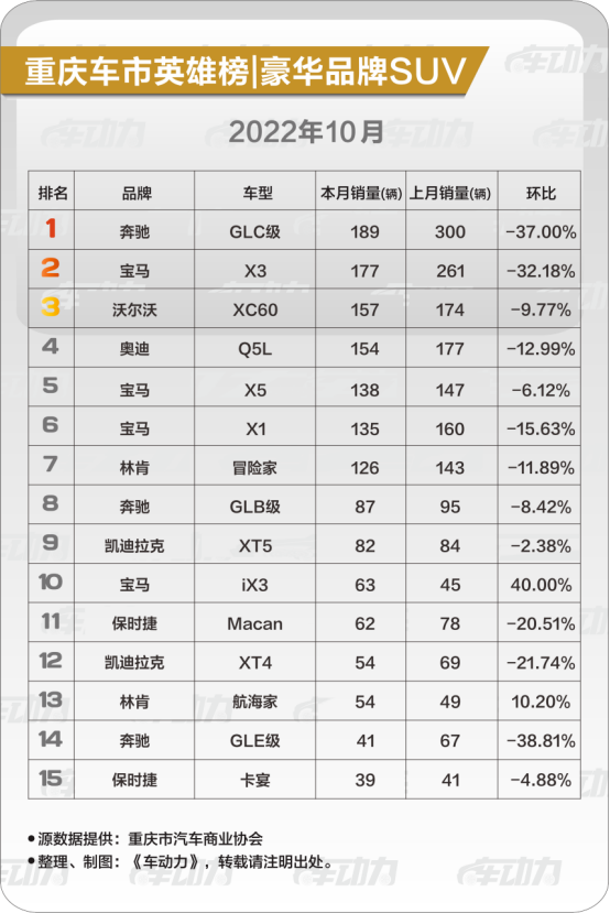 最后则是10月的《重庆车市丨豪华品牌SUV》销量分榜,“下滑”再次成为了“主旋律”。