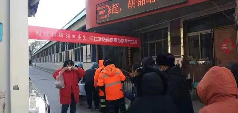 12月15日起,北京同仁堂医养集团首批投放一万袋北京同仁堂中医医院“抗疫经验方汤剂”,居民在黄寺综合门诊部排队取药。受访者供图
