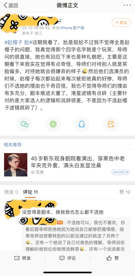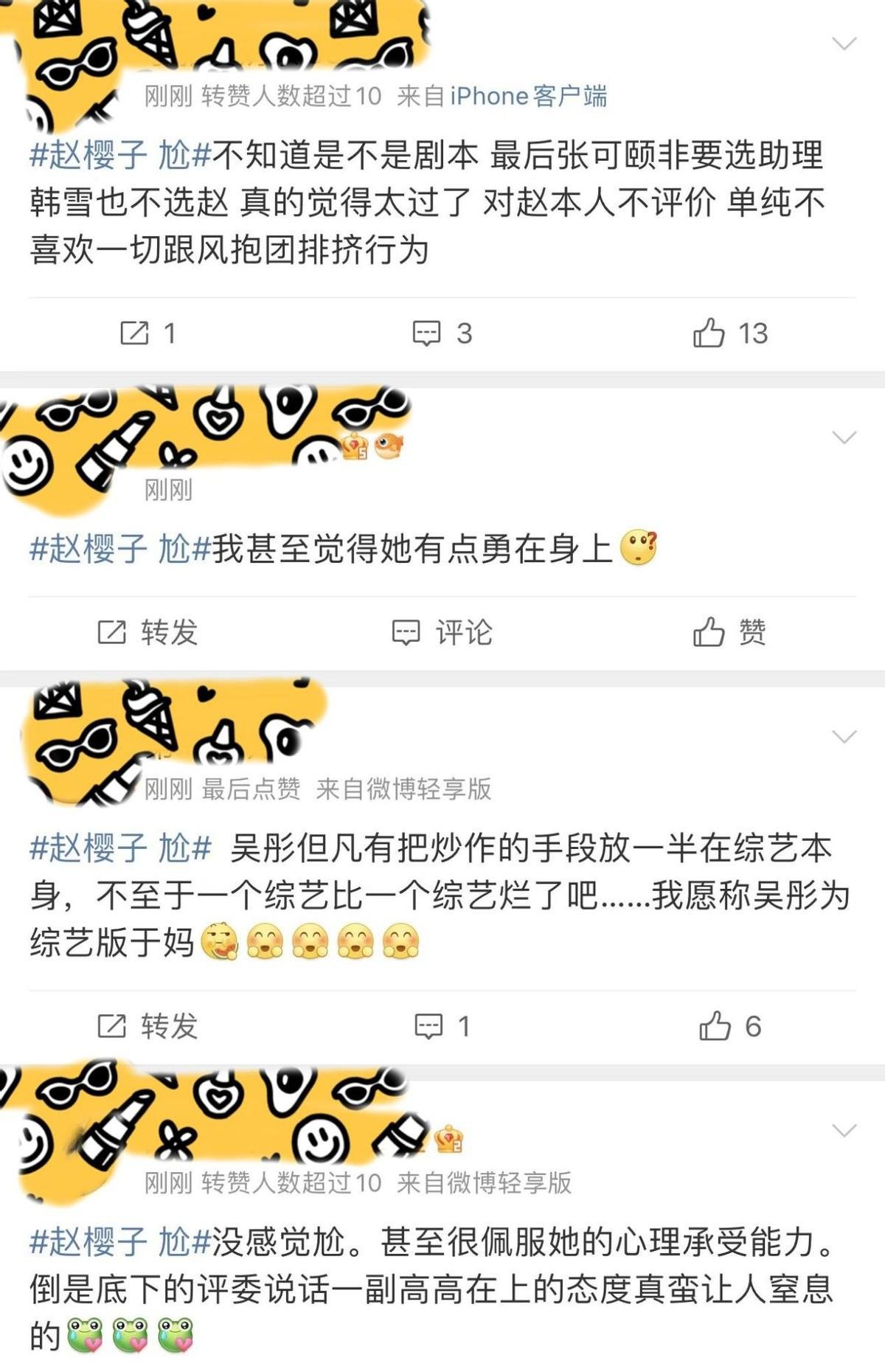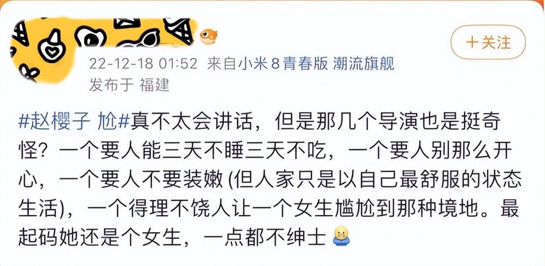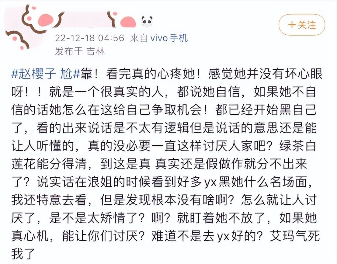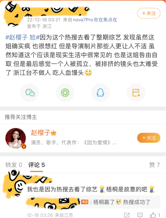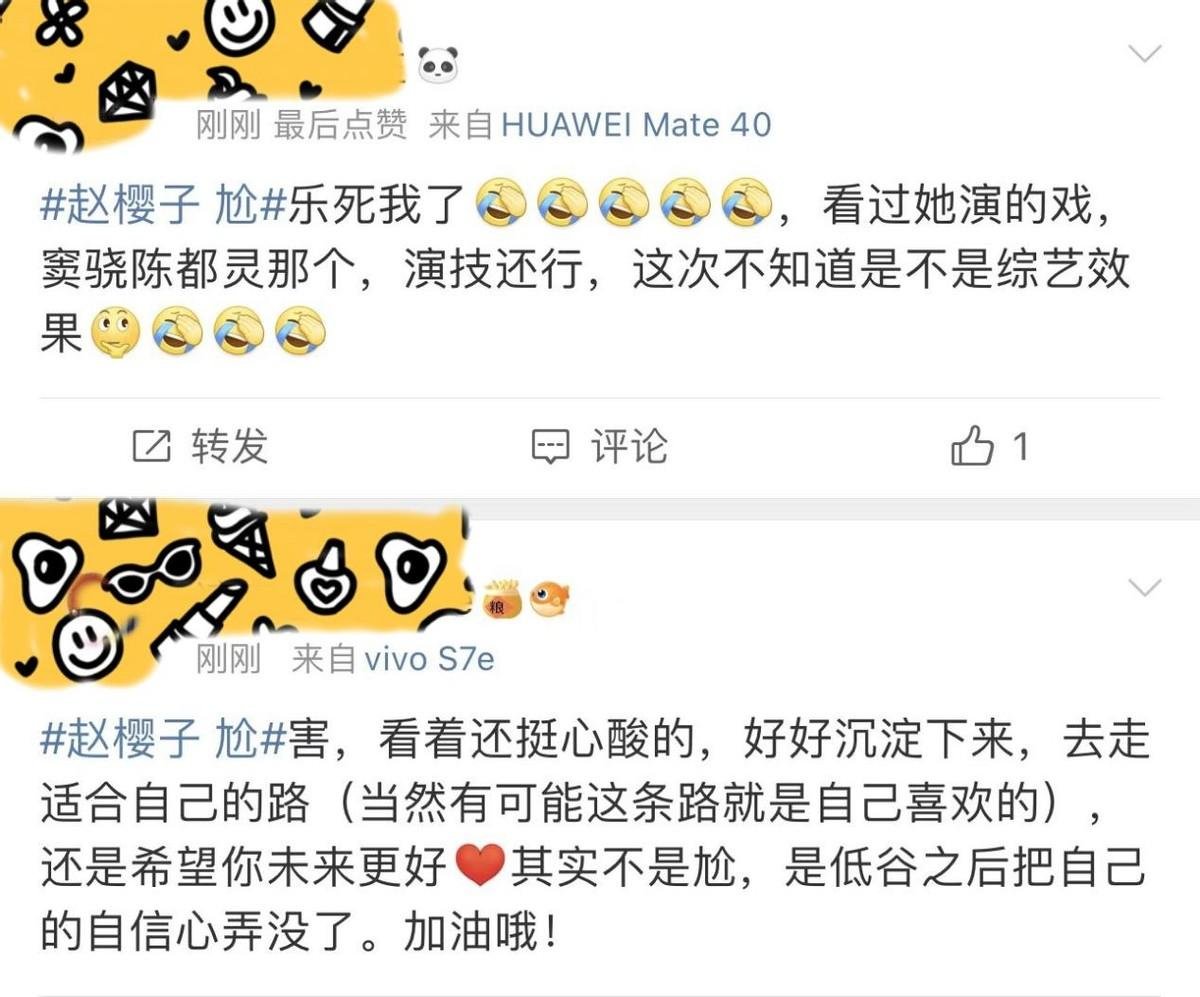 还有人觉得,赵樱子是像浪姐3那样,再一次被节目组坑了,她被当成了制造热点的工具人,“过度消费赵樱子的热度”、“为了流量罔顾演员尊严”等等声音也不绝于耳。