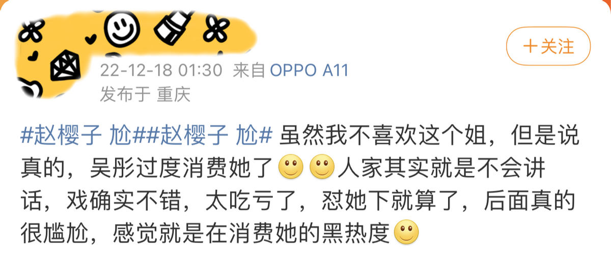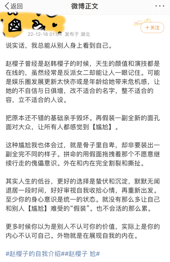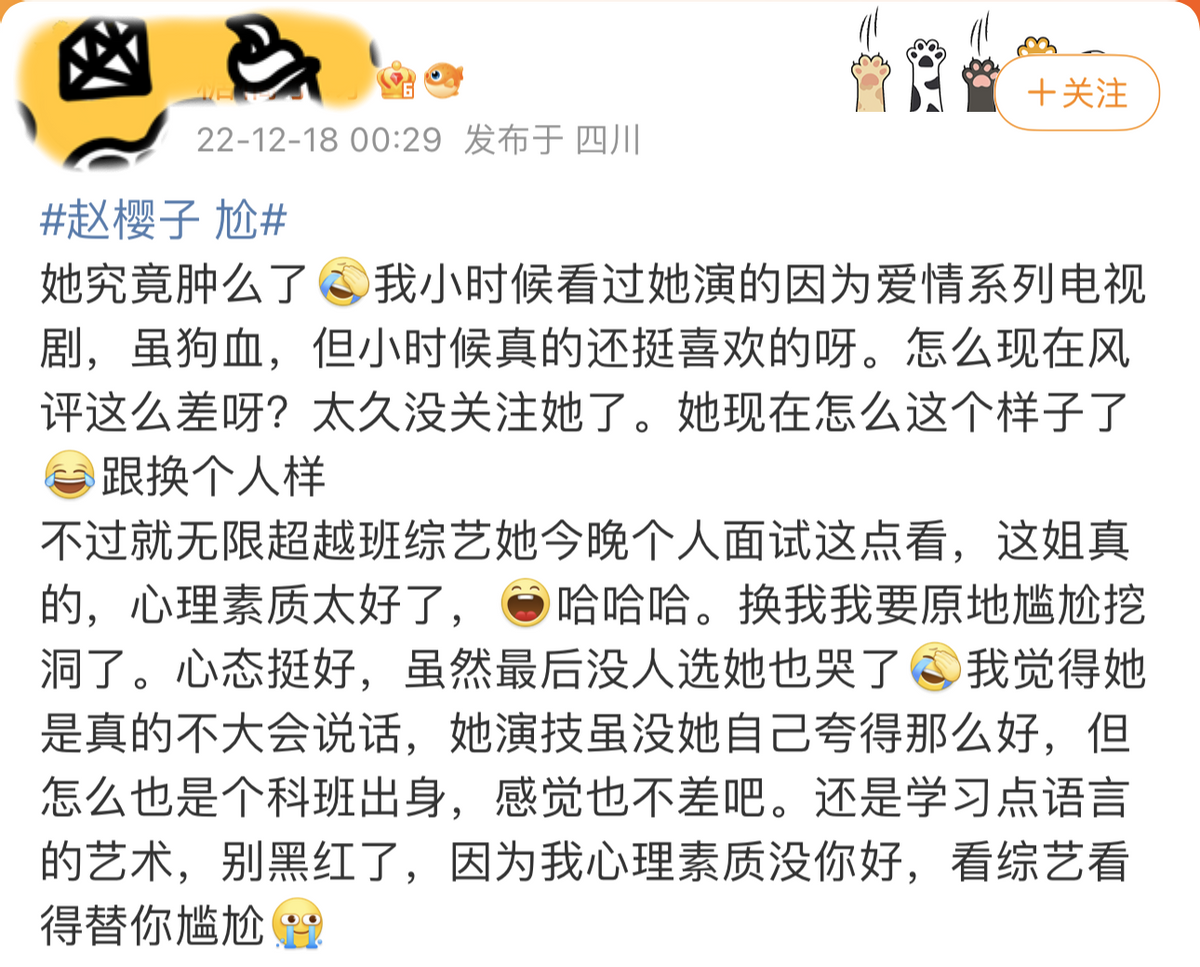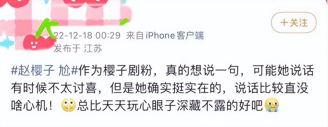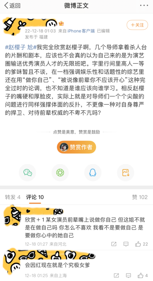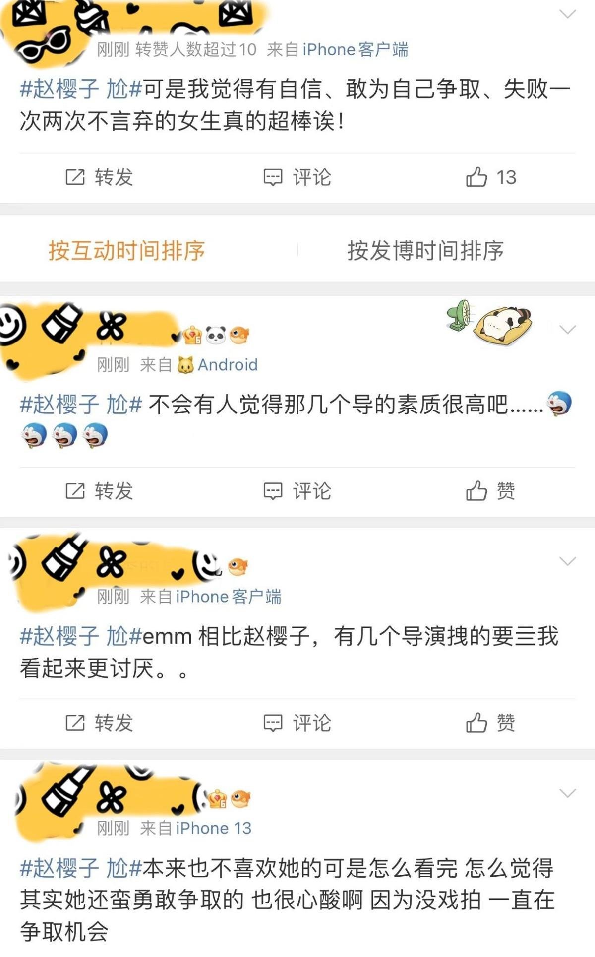 还有人觉得,赵樱子是像浪姐3那样,再一次被节目组坑了,她被当成了制造热点的工具人,“过度消费赵樱子的热度”、“为了流量罔顾演员尊严”等等声音也不绝于耳。