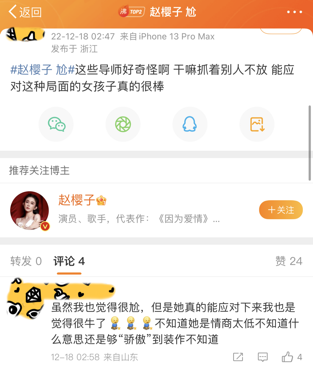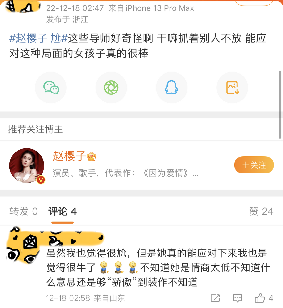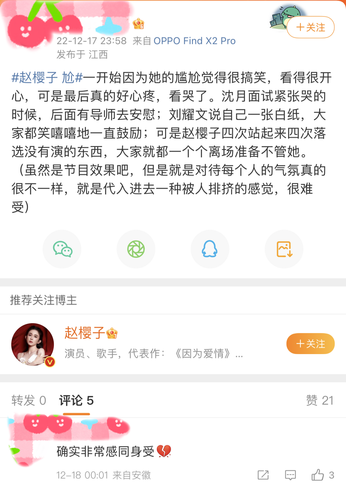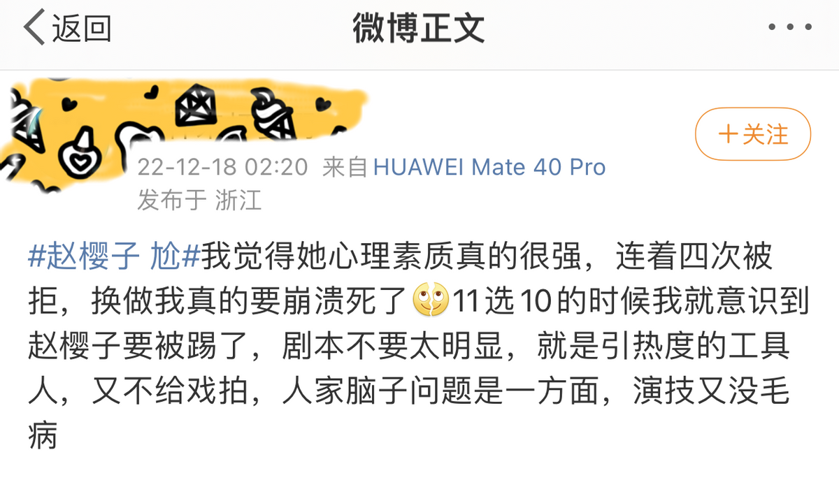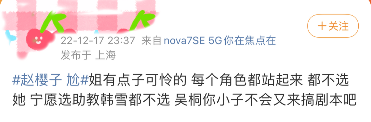 还有人觉得,赵樱子是像浪姐3那样,再一次被节目组坑了,她被当成了制造热点的工具人,“过度消费赵樱子的热度”、“为了流量罔顾演员尊严”等等声音也不绝于耳。