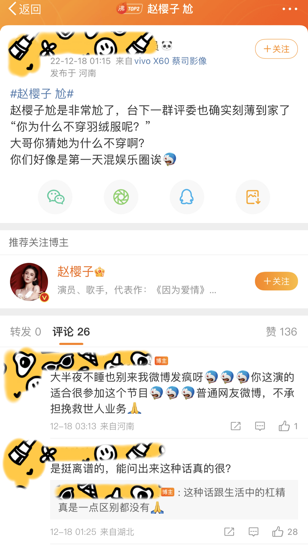 提及当年的红毯晕倒事件,赵樱子解释自己当时连续拍了四十多个小时的戏,本来就有点低血糖,在极其寒冷的冬天里又只能穿吊带裙,所以真的没扛住。然而尔冬升一句“为什么不穿羽绒服”的质疑,就让网友反过来质疑尔导有点“装外宾”了,很多人都是替赵樱子不平,“谁见过女星穿羽绒走红毯?为了让大家觉得漂亮,女明星不都得美丽冻人”?