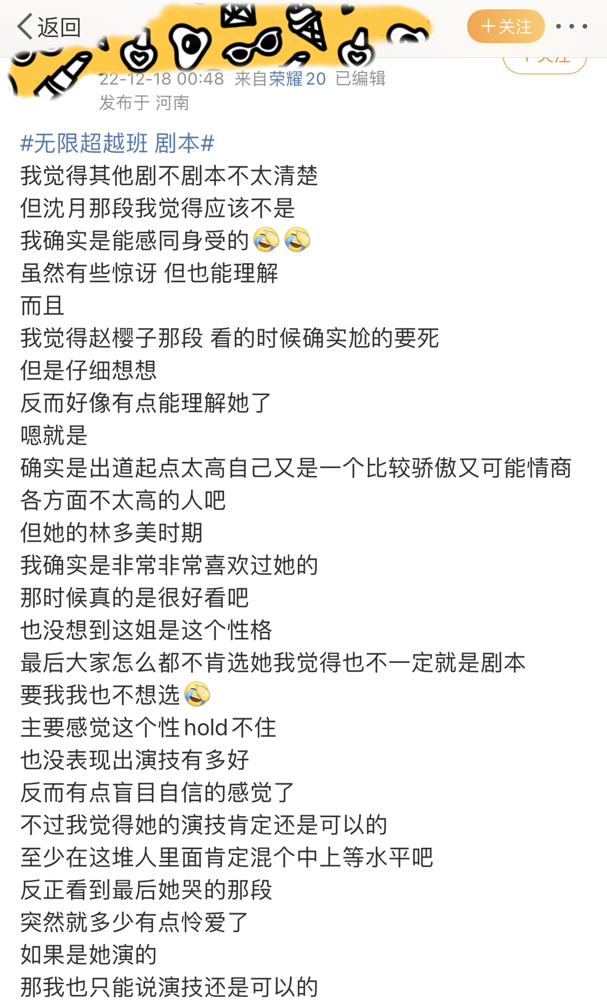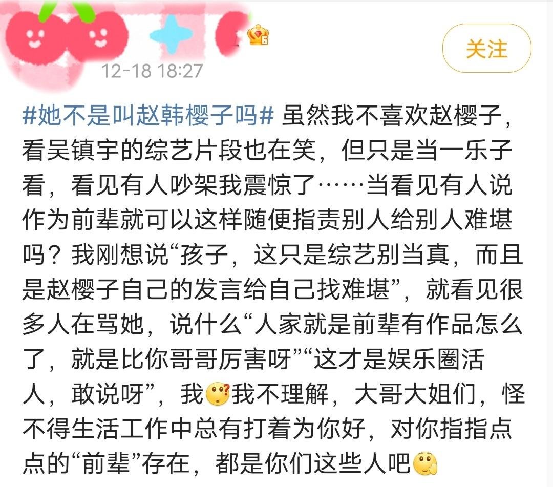 整期节目追看下来,有网友发现,前辈们的态度多少有点奇怪,对其他演员大多数时候和颜悦色,但是近乎尖酸,甚至不留情面地曲解赵樱子,这也引发了很多观众看节目时的不适感,让大家都想替赵樱子打抱不平了,许多人表示疑问,赵樱子是不是被孤立和排挤了?