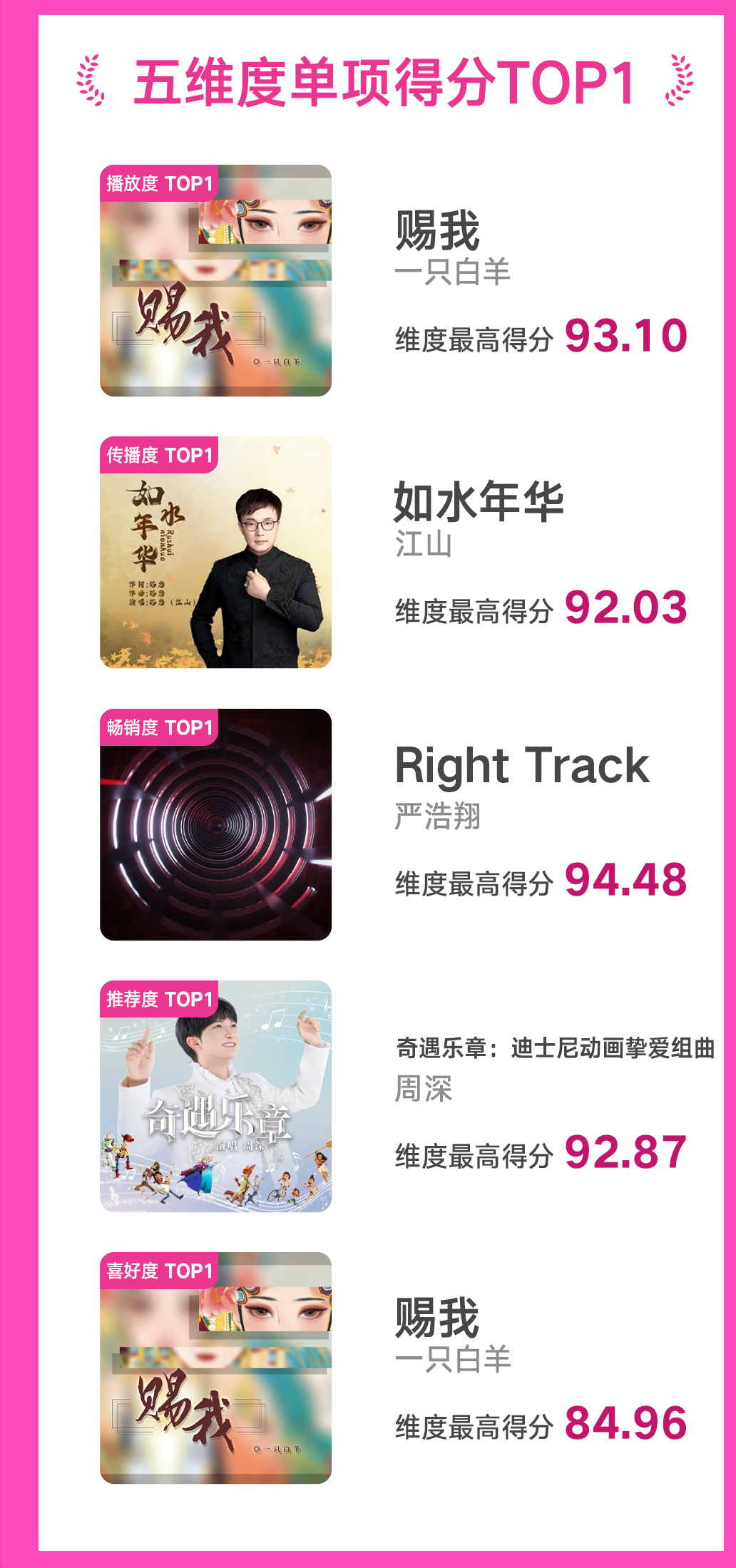 本次盘点中,除了专辑、作品以及歌手三项最佳总结外,官方还从播放度、传播度、畅销度、推荐度以及喜好度五大维度推荐了位列Top1的歌曲。歌手一只白羊凭借作品《赐我》获得播放度Top1、喜好度Top1两项成就,作品古风旋律撩人心弦,听众单曲循环度极高。畅销度TOP1歌曲为《Right Track》,演唱歌手严浩翔挑战方言rap,以嘻哈音乐潜力股的姿态受到热捧。江山的《如水年华》则依靠饱满的深情唱出了岁月与生活的心声,获得Top1传播度。周深的《奇遇乐章:迪士尼动画挚爱组曲》则赢得了推荐度Top1的成绩。